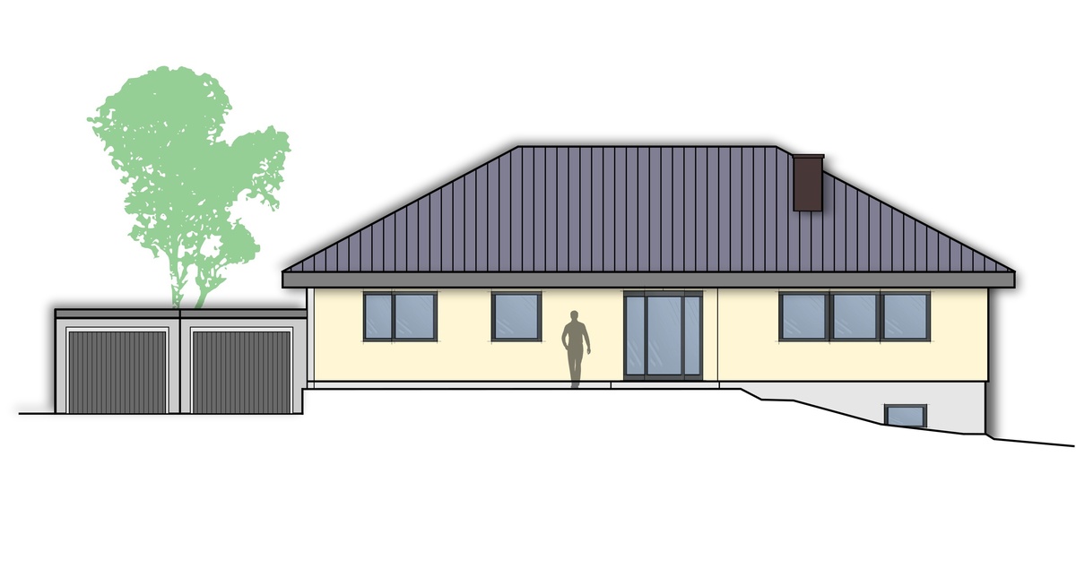 Der Haupt-Wohnbereich ermöglicht Wohnen auf einer Ebene – bestehend aus zwei Schlafzimmern sowie einem sehr großzügigen Wohn- und Esszimmer. Große, bodentiefe Fenster lassen viel Licht einfallen und geben den Blick auf die umliegende Landschaft frei. Der Ausblick ist unverbaubar und verleiht dem Wohnraum eine besondere Weite. Eine offene Küche zum Essbereich lässt sich auf Wunsch problemlos realisieren und schafft ein modernes, kommunikatives Wohnkonzept.