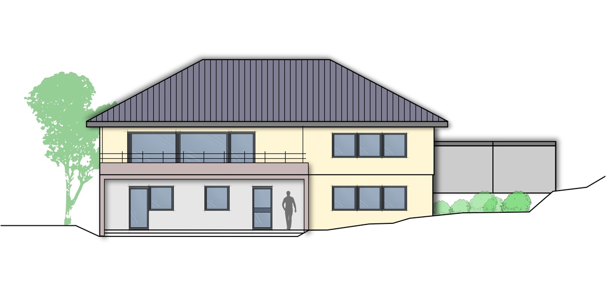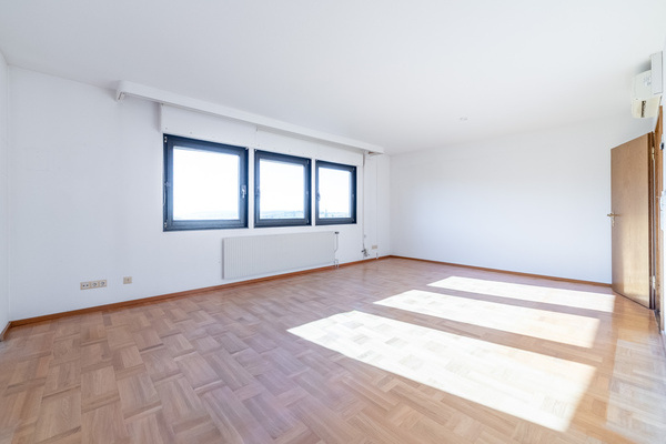 Der Haupt-Wohnbereich ermöglicht Wohnen auf einer Ebene – bestehend aus zwei Schlafzimmern sowie einem sehr großzügigen Wohn- und Esszimmer. Große, bodentiefe Fenster lassen viel Licht einfallen und geben den Blick auf die umliegende Landschaft frei. Der Ausblick ist unverbaubar und verleiht dem Wohnraum eine besondere Weite. Eine offene Küche zum Essbereich lässt sich auf Wunsch problemlos realisieren und schafft ein modernes, kommunikatives Wohnkonzept.