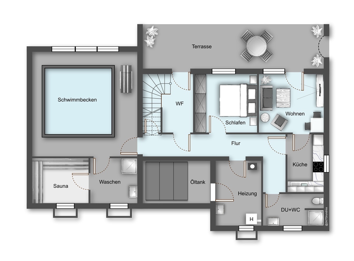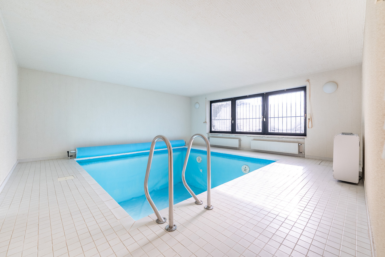 Im Untergeschoss wartet ein besonderes Highlight: Ein bereits vorhandener Wellnessbereich mit Sauna und Innenpool (reaktivierbar). Nach einem anspruchsvollen Arbeitstag bietet dieser Bereich ideale Bedingungen, um zur Ruhe zu kommen und neue Energie zu tanken.